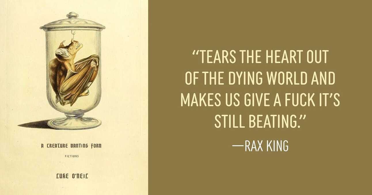 You read the interview, now read the book. A Creature Wanting Form is, to put it plainly, one of the only works of fiction that seems to be fully in touch with the exact time it was written. It’s easier to digest the last few years and plug a book idea into the recent past than it is to place characters into last week, but O’Neil does an incredible job of dunking readers into the existential or supernatural terrors of modern life—whether that’s a literal monster, or just grappling with knowing how to hang a flag at half-mast when there’s a new mass shooting every day. What makes it all work, however, it’s the prose itself—written with an immediate voice in a conversational tone, each story is lean and charged with momentum. If anything, A Creature Wanting Form is the dark world mirror of a Borges collection: instead of erudite academics delivering unto us universal world truths through rigorous study, O’Neil’s barstool philosophers give us a “life sucks” monologue that peels back the protective shell around your own humanity further than you ever imagined it could go. Reading it almost feels like poking at a raw nerve, but sometimes you gotta just pick at something until it bleeds in order to know your heart is still pumping blood the right way.