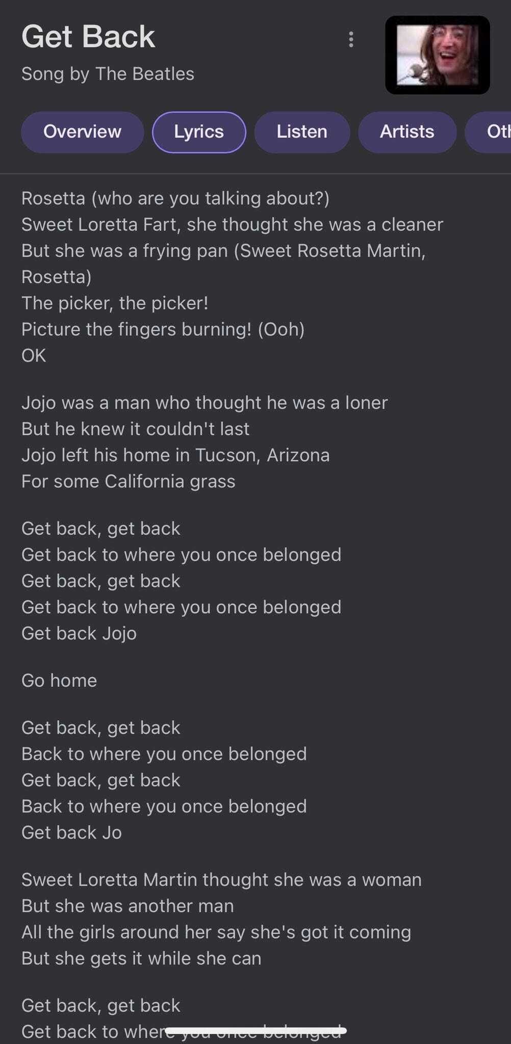 Like most Beatles songs, the lyrics are gibberish. And, because Lennon and McCartney were skilled at finding catchy melodies, most Beatles fans are entirely prepared to apply some sort of meaning to the lyrics. That doesn’t mean you’re not allowed to enjoy “Get Back,” but by all accounts Lennon and McCartney writing all their own songs while mostly in a studio deadline environment and then taking all the writing credit is more of a publishing scam than it is an expression of artistic excellence. And the fact that their well-crafted pop songs from 8 years earlier made them amongst the best selling artists of their time, it didn’t matter what they crapped out. People would buy it anyway.