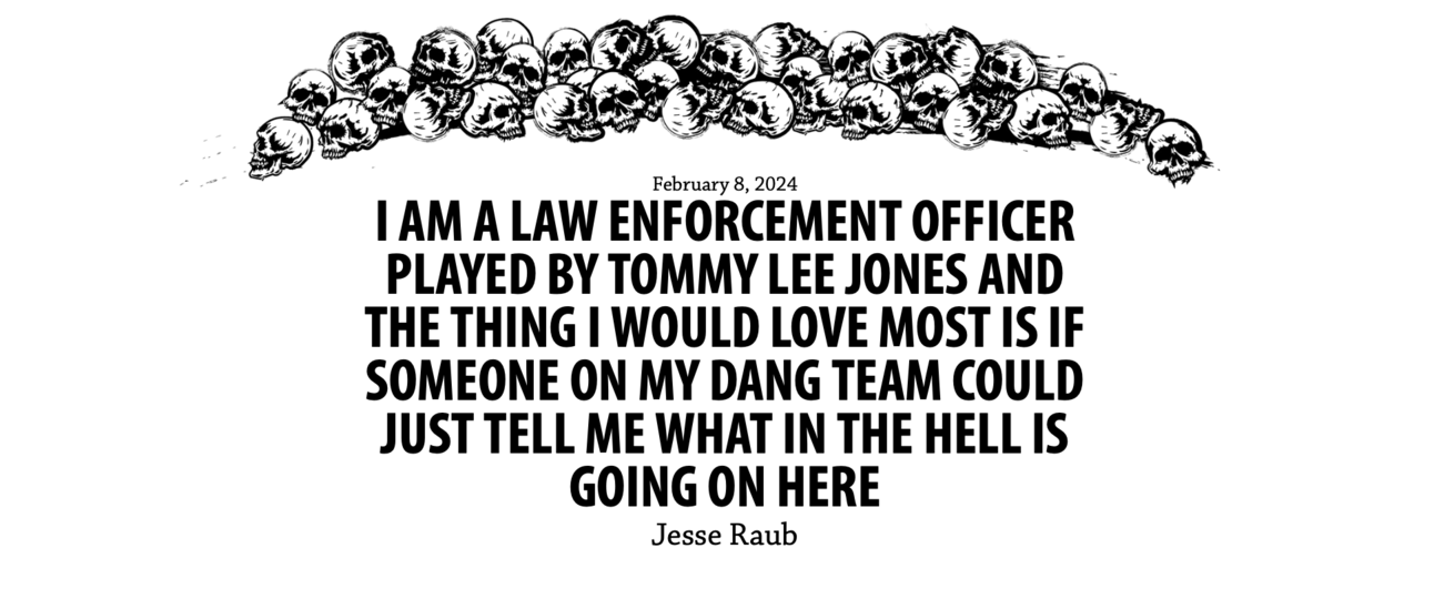 - I AM A LAW ENFORCEMENT OFFICER PLAYED BY TOMMY LEE JONES AND THE THING I WOULD LOVE MOST IS IF SOMEONE ON MY DANG TEAM COULD JUST TELL ME WHAT IN THE HELL IS GOING ON HERE at HAD